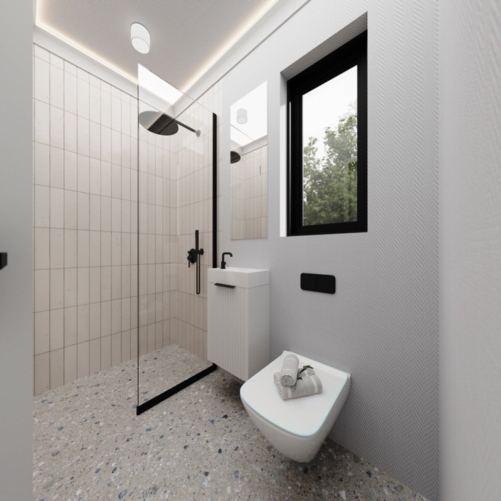 The bathroom is elegant and functional, featuring a generous shower, toilet, and sink, all incorporated into a compact space. The bathroom design optimizes every square inch without sacrificing comfort or aesthetic appeal.